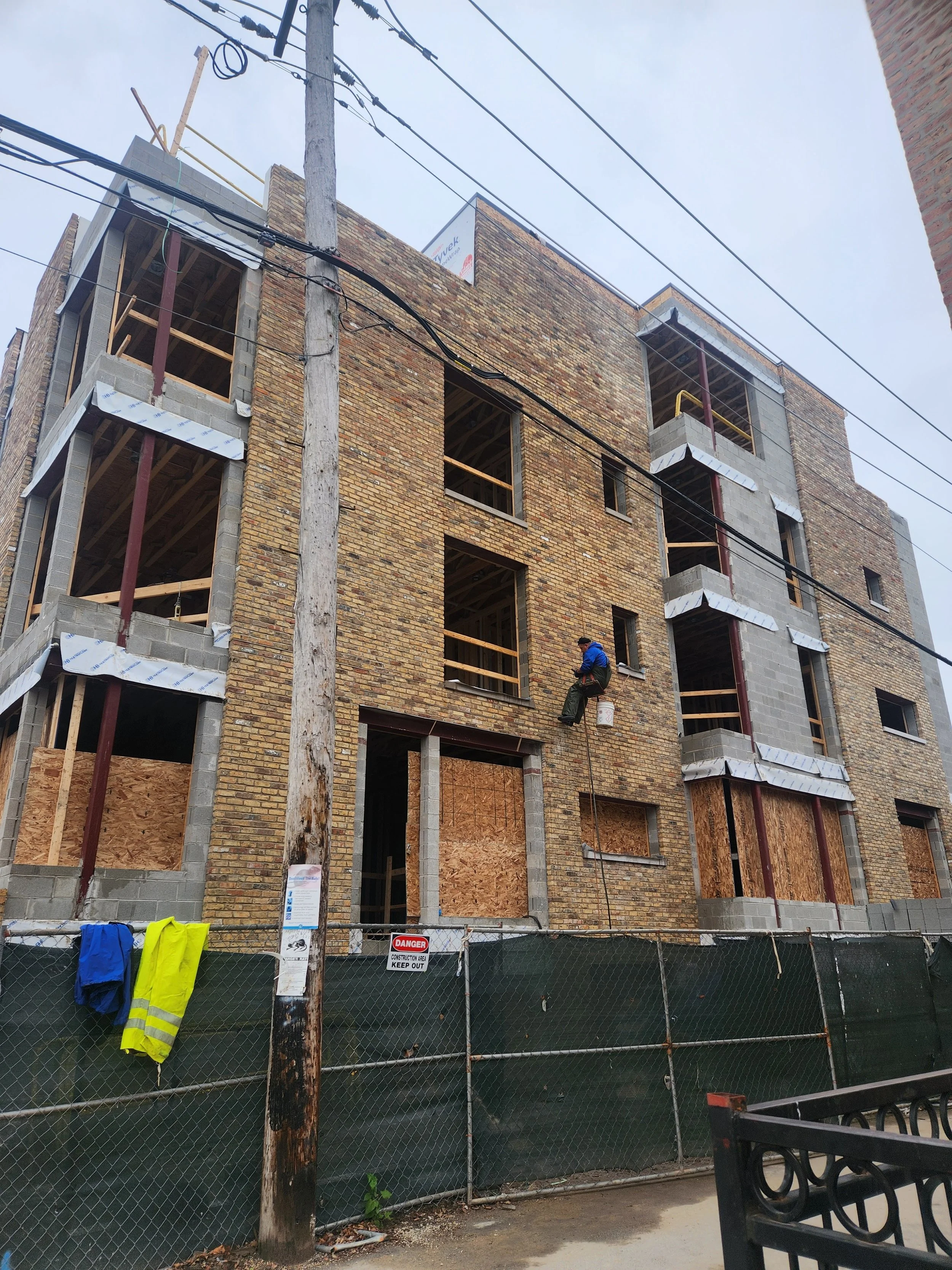 Exterior work has made good progress these past few weeks now that the weather is a bit warmer. The siding and coping was finally completely finished this week! The brick garden wall for unit 1E was finished this week as well! And we also started decking installation for units 2 and 3.